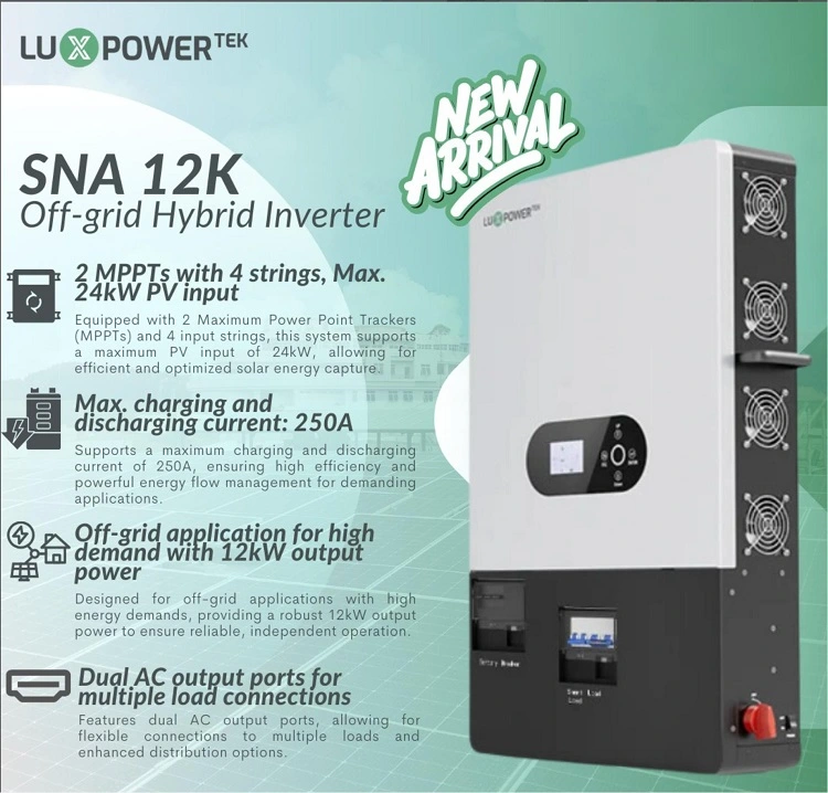 Sự đột phá mới nhất của Luxpower trong các giải pháp năng lượng ngoài lưới, mô hình Sunlink, Luxpower SNA-EU 12000, cung cấp một sản lượng điện mạnh mẽ 12kW. Được thiết kế cho độ tin cậy và tính linh hoạt, nó cung cấp quản lý năng lượng liền mạch trên các ứng dụng khác nhau.