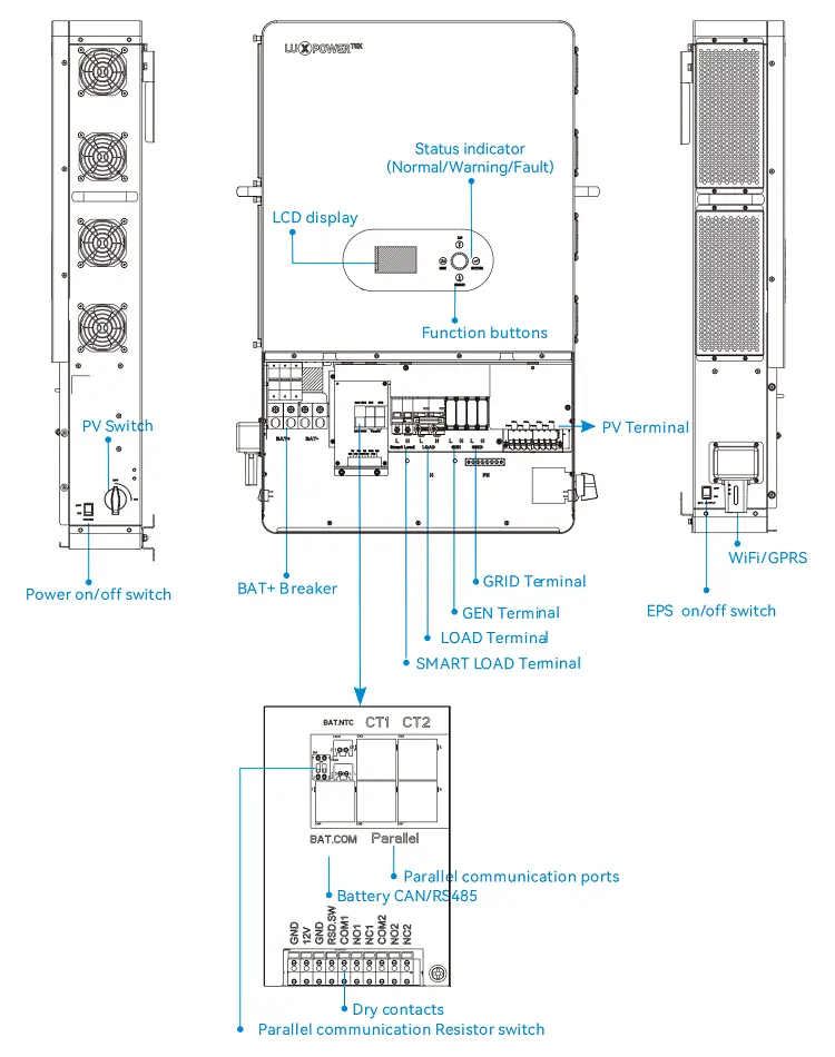 Thiết kế mô -đun của nó hỗ trợ kết nối song song của tối đa 16 đơn vị, cung cấp khả năng mở rộng nâng cao để đáp ứng nhu cầu năng lượng đa dạng. Được trang bị một cổng tải độc lập hỗ trợ tải nửa sóng, nó thể hiện khả năng đặc biệt trong việc xử lý các yêu cầu tải khác nhau. Luxpower SNA-EU 12000 có khả năng vượt qua 100A và cổng máy phát chuyên dụng, cho phép tích hợp liền mạch với các hệ thống trên lưới hiện có.