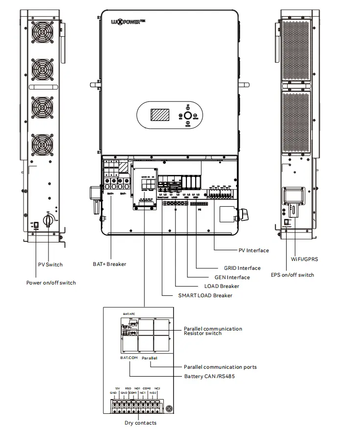 Được thiết kế cho khả năng phục hồi, Luxpower SNA-US 12000 có các cổng đầu ra AC kép cho kết nối đa tải và khả năng vượt qua liên tục 100A mạnh mẽ. Cổng máy phát chuyên dụng của nó và chuyển đổi trên lưới/ngoài lưới liền mạch đảm bảo cung cấp điện không bị gián đoạn trong các điều kiện đòi hỏi.