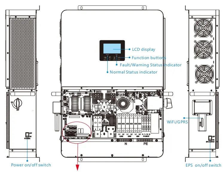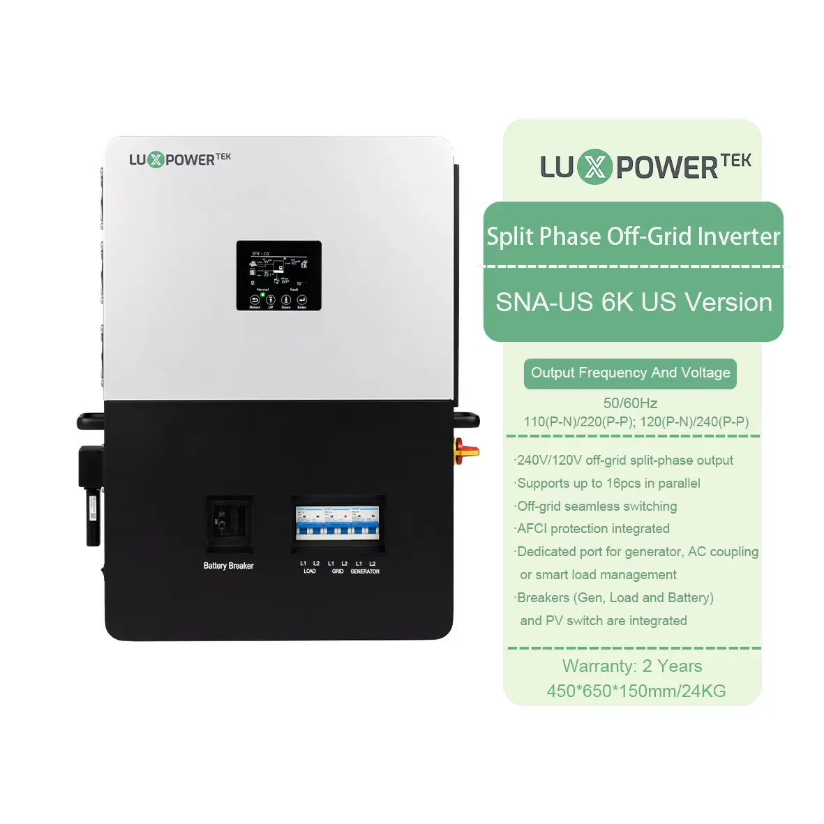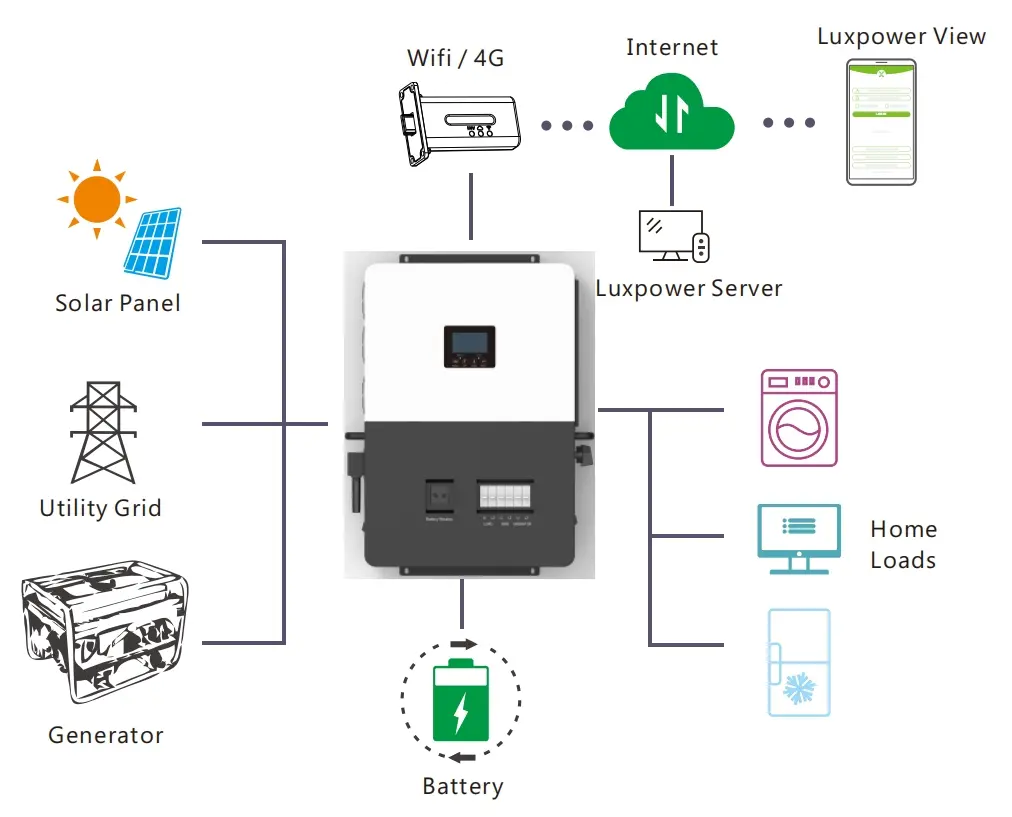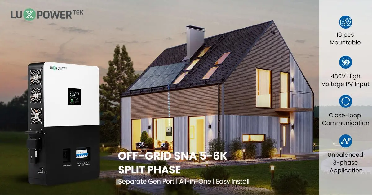 Được thiết kế để lưu trữ năng lượng ngoài lưới, LuxPower SNA US 6000 có giao diện máy phát chuyên dụng và giao diện EPS với công suất đầu ra 6kW.
